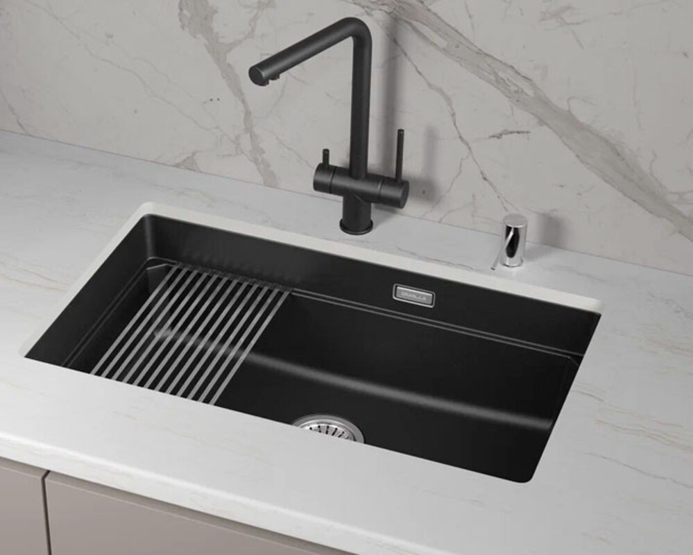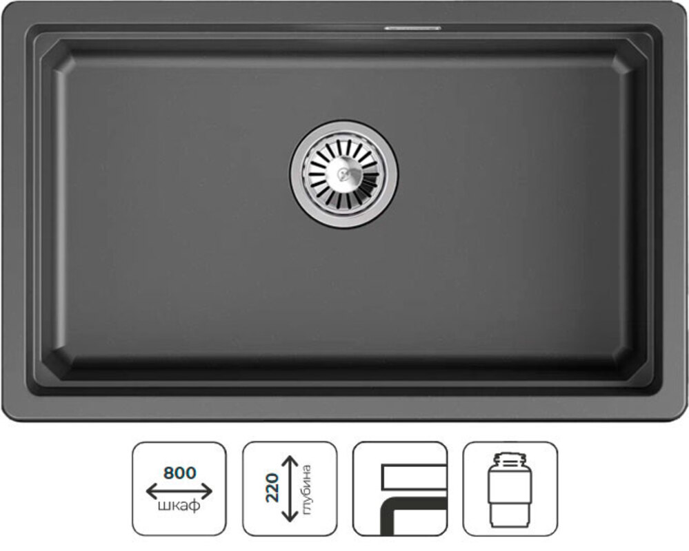 Мойка в оттенке «шварц» (чёрный металлик) добавляет стильный акцент на современной кухне, гармонично сочетаясь с различными типами столешниц, включая каменные, композитные и ламинированные.
