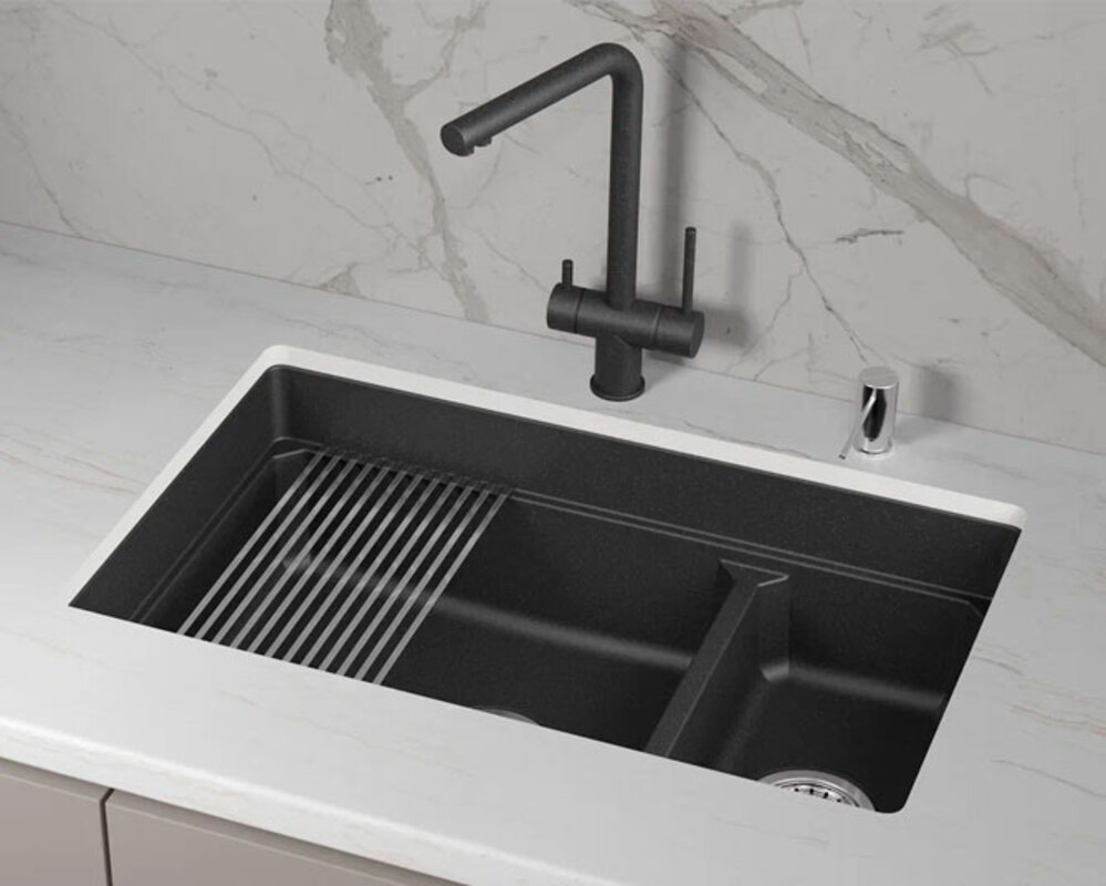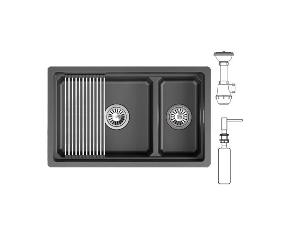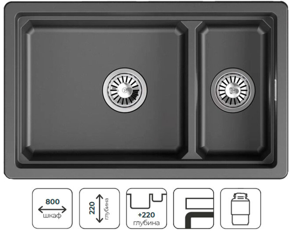 — двухсекционная прямоугольная мойка из кварцевого композита премиального класса. Предназначена для подстольной установки в стандартный шкаф шириной 80 см.