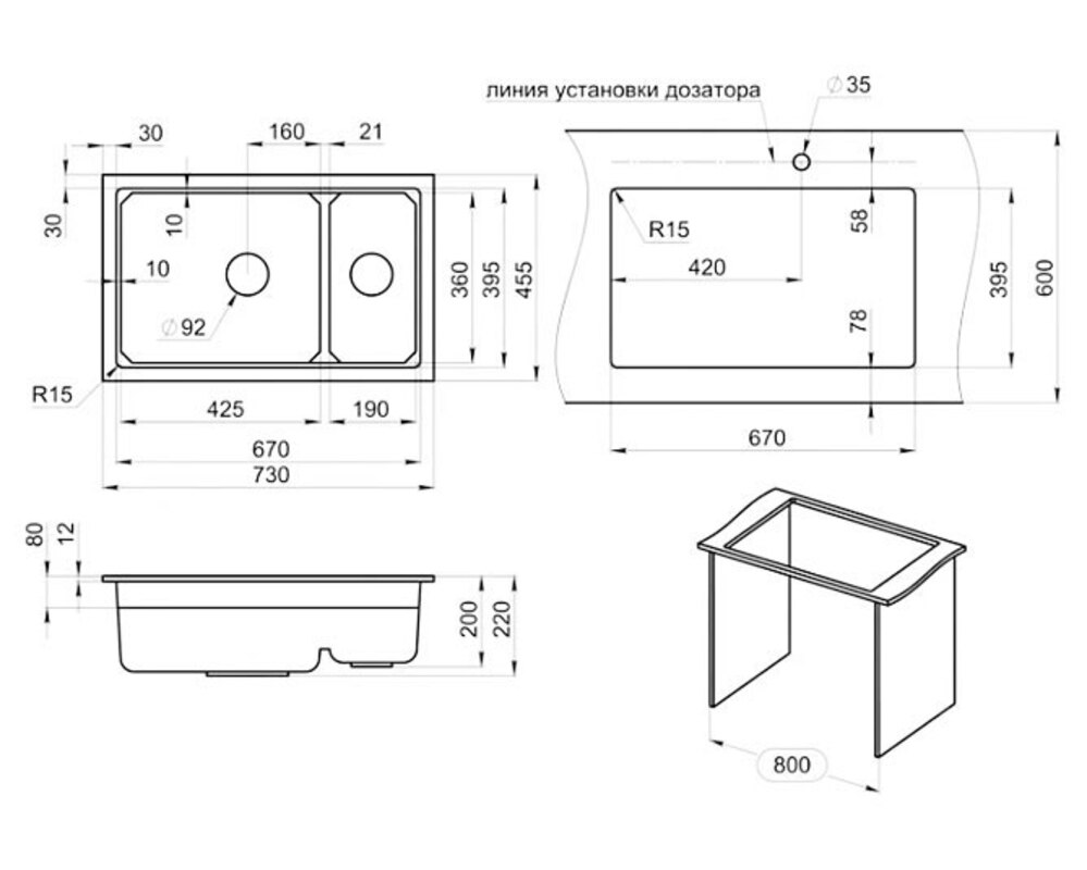 - Комплектация: ролл-мат, дозатор (нерж.), сифон с отводом, крепления