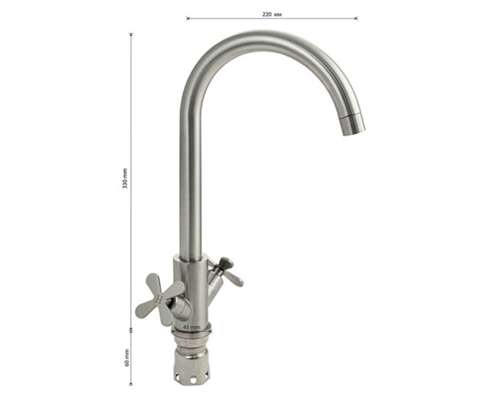 Габаритные размеры: высота 330 мм, длина 220 мм, диаметр посадочного седла 45 мм, длина резьбы 60 мм, длина подводки 450 мм.