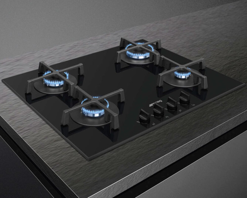 — газовая варочная панель из коллекции Selezione, выполненная из черного закаленного стекла с прямым краем для установки вровень со столешницей.